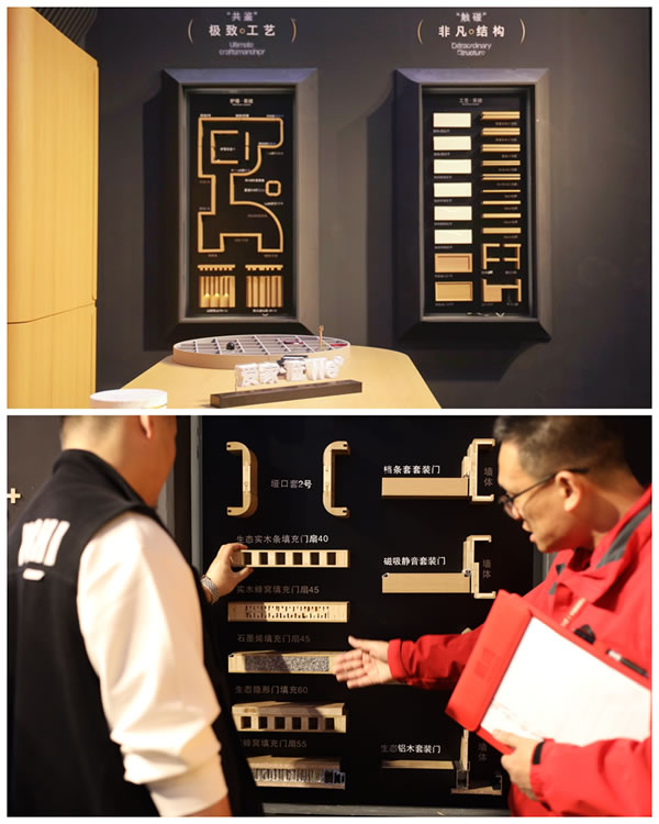 作為此次展會(huì)的"現(xiàn)象級(jí)"展品,鵬鴻工法墻以模塊化系統(tǒng)思維,通過(guò)"解構(gòu)式"陳列,將工藝系統(tǒng)、木門(mén)系統(tǒng)與護(hù)墻系統(tǒng)整合,58個(gè)工藝模塊覆蓋結(jié)構(gòu)、裝飾與功能三大維度,清晰呈現(xiàn)全屋定制的工藝系統(tǒng)。